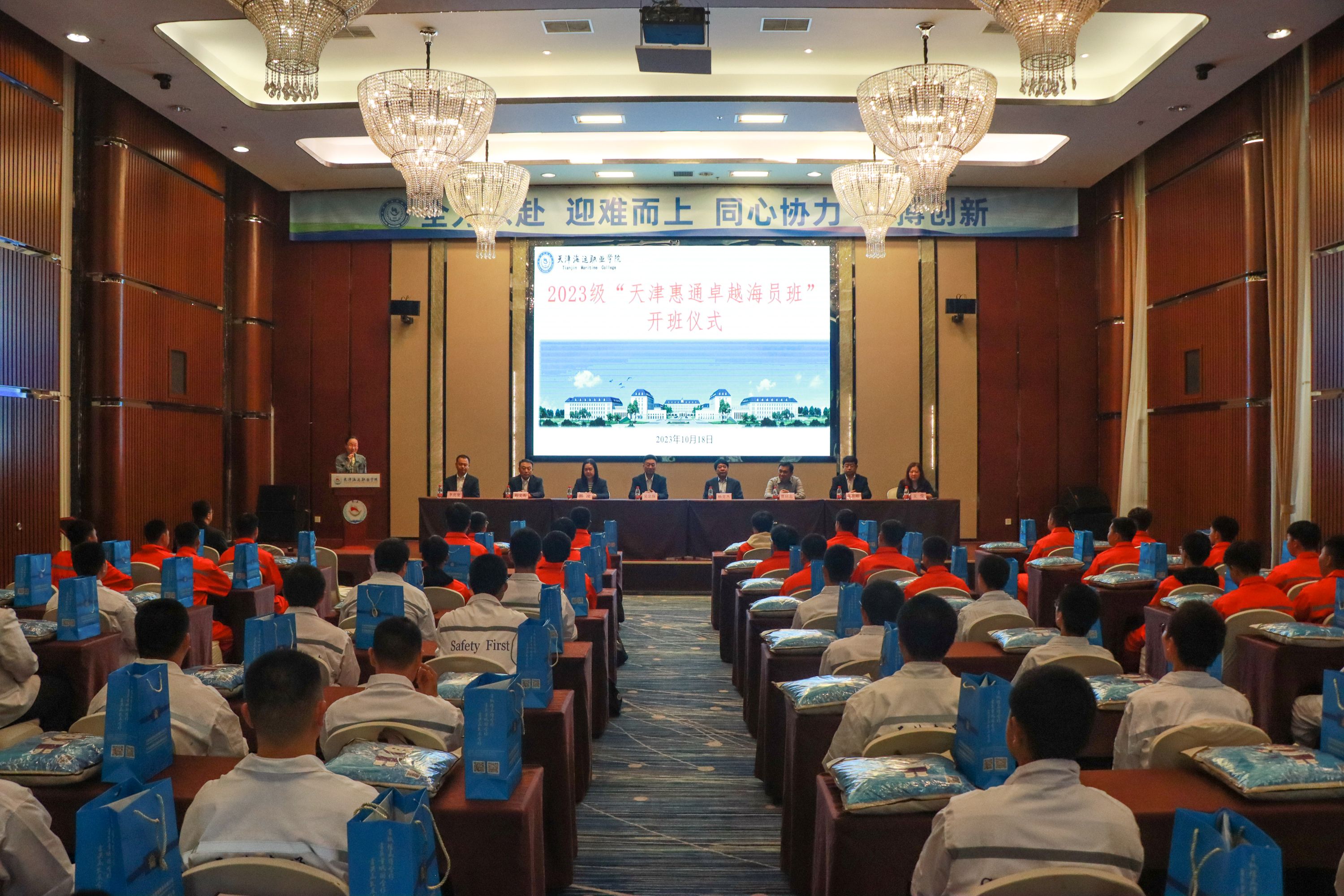 10月19日,天津海運(yùn)學(xué)院2023級(jí)“天津惠通卓越海員班”開班儀式在學(xué)校海郵酒店舉行。天津海運(yùn)學(xué)院院長吳宗保,航海技術(shù)系黨支部書記韓凌,航海技術(shù)系主任程文閣、李亮寬出席會(huì)議,公司董事長兼總經(jīng)理?xiàng)羁私?,副總?jīng)理賈啟志、朱有順、王瑩,2023級(jí)訂單班輔導(dǎo)員及訂單班全體同學(xué)參加開班儀式。