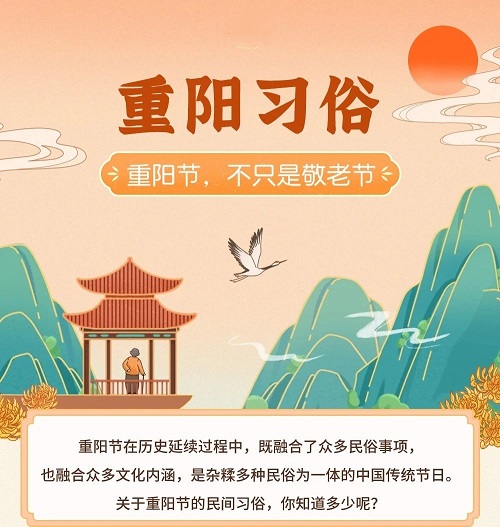 “九九老陽,陽極必變”,所以在九月九日,要前往山上登高望遠(yuǎn),祭拜山神以求吉祥。