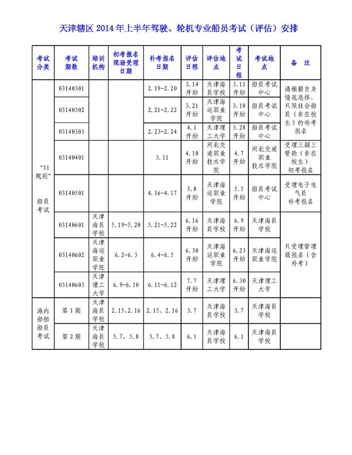 具體安排請詳見《天津轄區(qū)2014年上半年駕駛、輪機(jī)專業(yè)船員考試(評估)安排》(附件2)和報名須知,報名時請注意報名期數(shù)、報名時間和考試時間。