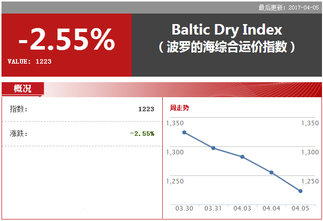 整體干散貨運(yùn)價(jià)指數(shù)連續(xù)第五日下跌,收跌32點(diǎn),或2.55%,為2月7日以來最大單日百分比跌幅,報(bào)1,223點(diǎn)。該指數(shù)衡量的是鐵礦石、水泥、谷物、煤炭和化肥等資源的運(yùn)輸費(fèi)用。