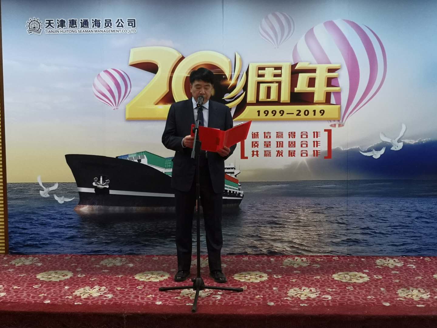 今天我們相聚在這里,共慶2019年新春,同時迎來惠通公司成立20周年慶典。在這喜慶的日子里,我們請來了一直關(guān)心和支持我們惠通公司發(fā)展的各位嘉賓,以及20年來與我們并肩工作的船員兄弟們!