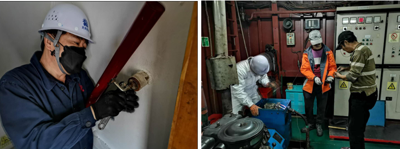 ? ? ? ?7:30到達(dá)碼頭,一行人員沒有休息片刻,馬上投入到緊張有序的維修保養(yǎng)工作中。根據(jù)船長反映的維修項目清單,大家先從駕駛臺入手檢查,薛俊琪雖已年近古稀,但他仍以飽滿的精神狀態(tài),投入到修理工作中來。首先,他把船舶申請修理的駕駛臺與船頭船尾的對講擴(kuò)音設(shè)備修理好,保證駕駛臺的操船指令能夠及時傳達(dá)出去。楊總還親自上陣,用從家里帶來的粘接劑,對駕駛臺防風(fēng)玻璃損壞的膠條進(jìn)行修復(fù)和粘接。根據(jù)輪機(jī)長反映的輔機(jī)時常跳電現(xiàn)象,馮總和薛俊琪兩人配合,對輔機(jī)進(jìn)行分析檢查,在機(jī)器馬達(dá)最不顯眼的地方找到了故障,修理過程中不斷開拓思路,創(chuàng)新維修方法,用最原始的工具將兩臺輔機(jī)全部修理完成。船長邢光耀和輪機(jī)長安全對各位領(lǐng)導(dǎo)的親歷親為非常佩服,表達(dá)感謝之余代表全體船員發(fā)聲:“領(lǐng)導(dǎo)們今日訪船我們真是既欽佩又感動,大家一定會以這種精神為榜樣,積極配合公司為船東做好服務(wù),為公司的發(fā)展貢獻(xiàn)自己的綿薄之力!”?