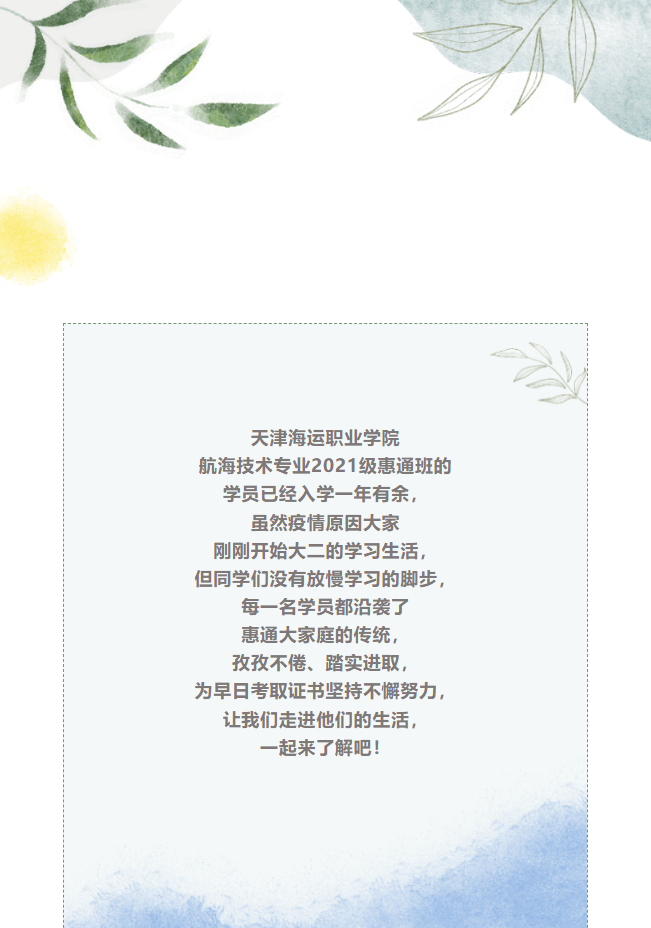 天津海運職業(yè)學院2021級惠通班學習側(cè)記 時間:2022-10-24 點擊:2217次 上一篇:當好公司宣傳員——天津海運職業(yè)學院2021級惠通班生活側(cè)記 下一篇:天津惠通開足馬力、鉚足干勁,以實際行動獻禮黨的二十大